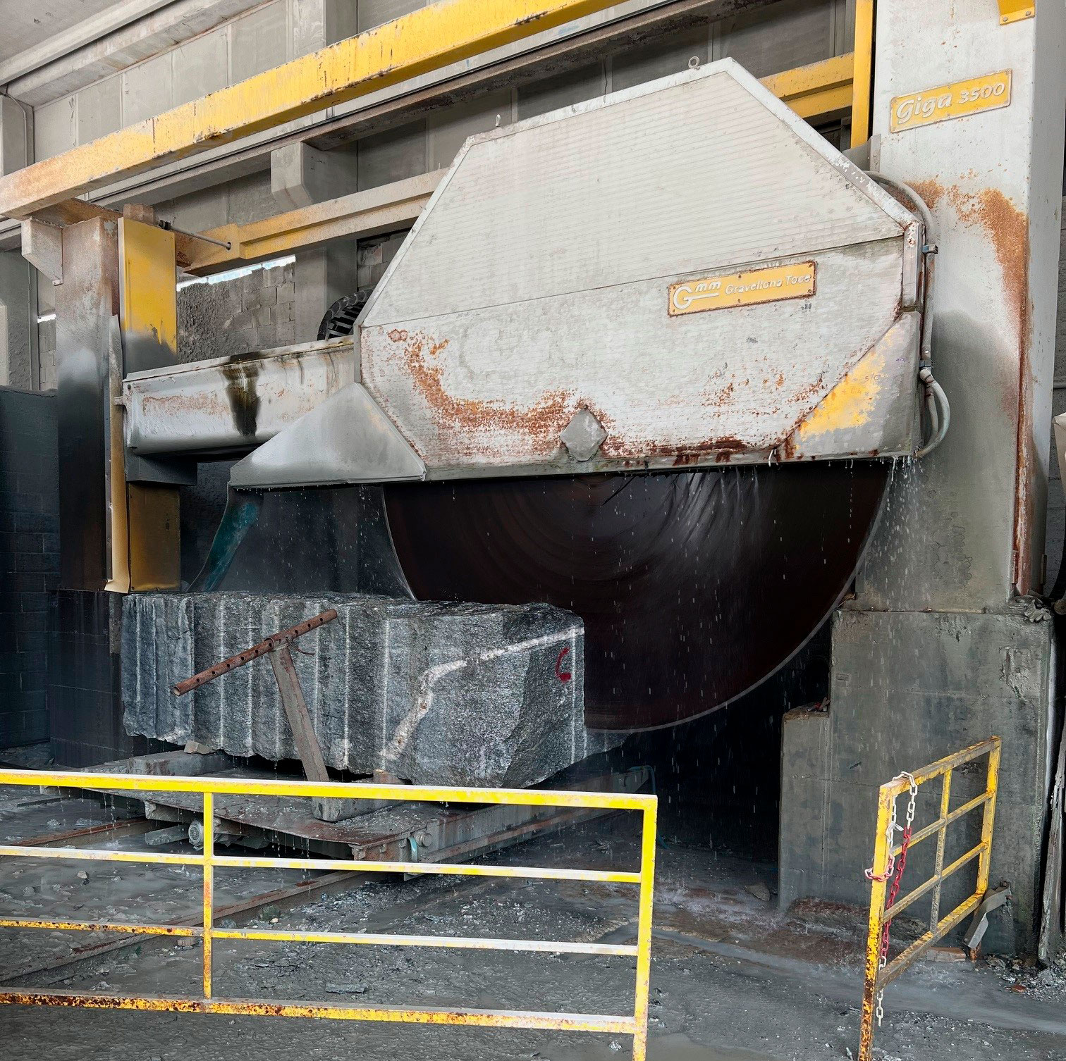 Den store portalsav opskærer mandshøje granitblokke, der senere forvandles til byggematerialer som fliser, bordplader m.m. Klingen måler Ø 3.500 MM.