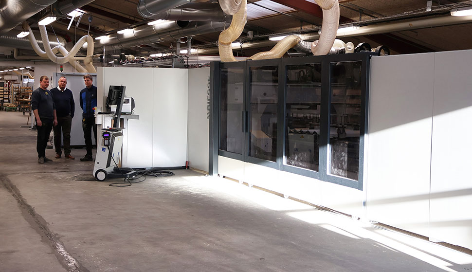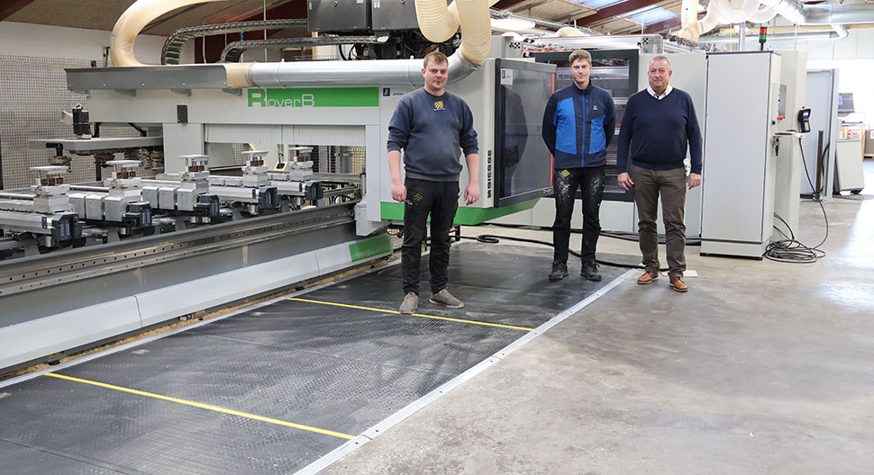 På billedet se Lars Knudsen og Frederik Holm Madsen sammen med Steen Hansen fra Junget. Maskinen er en Biesse CNC af typen Rover B 5a.