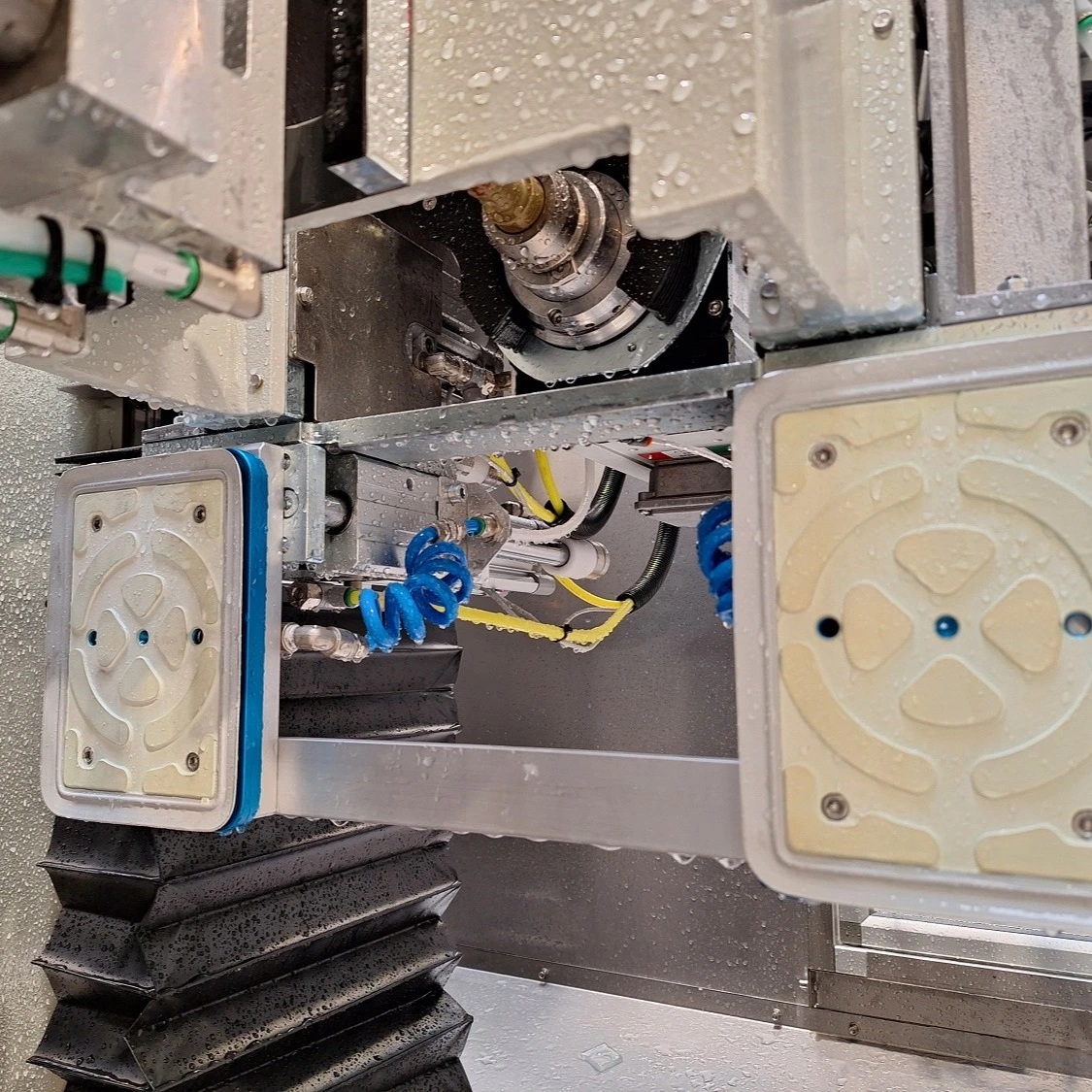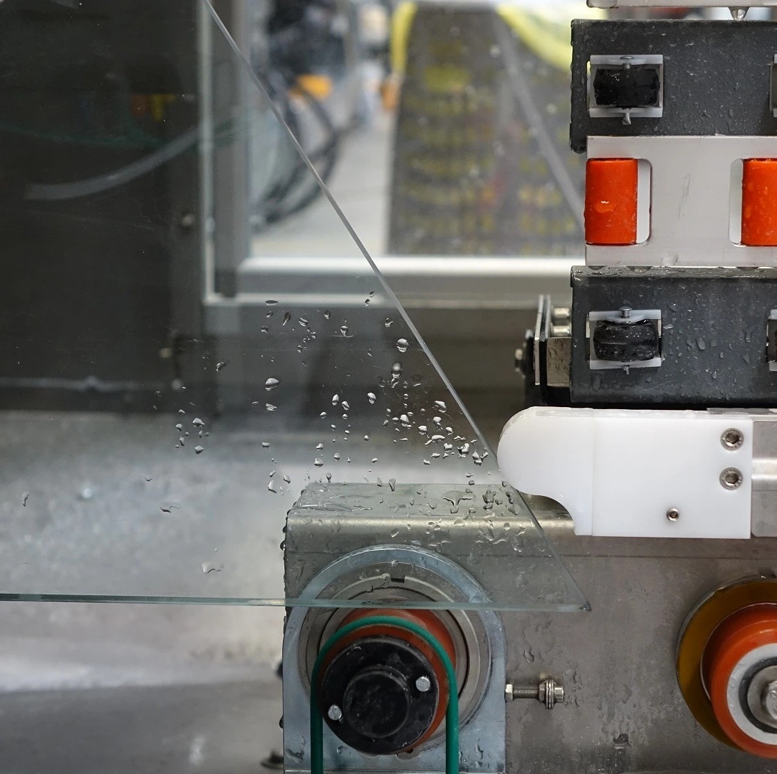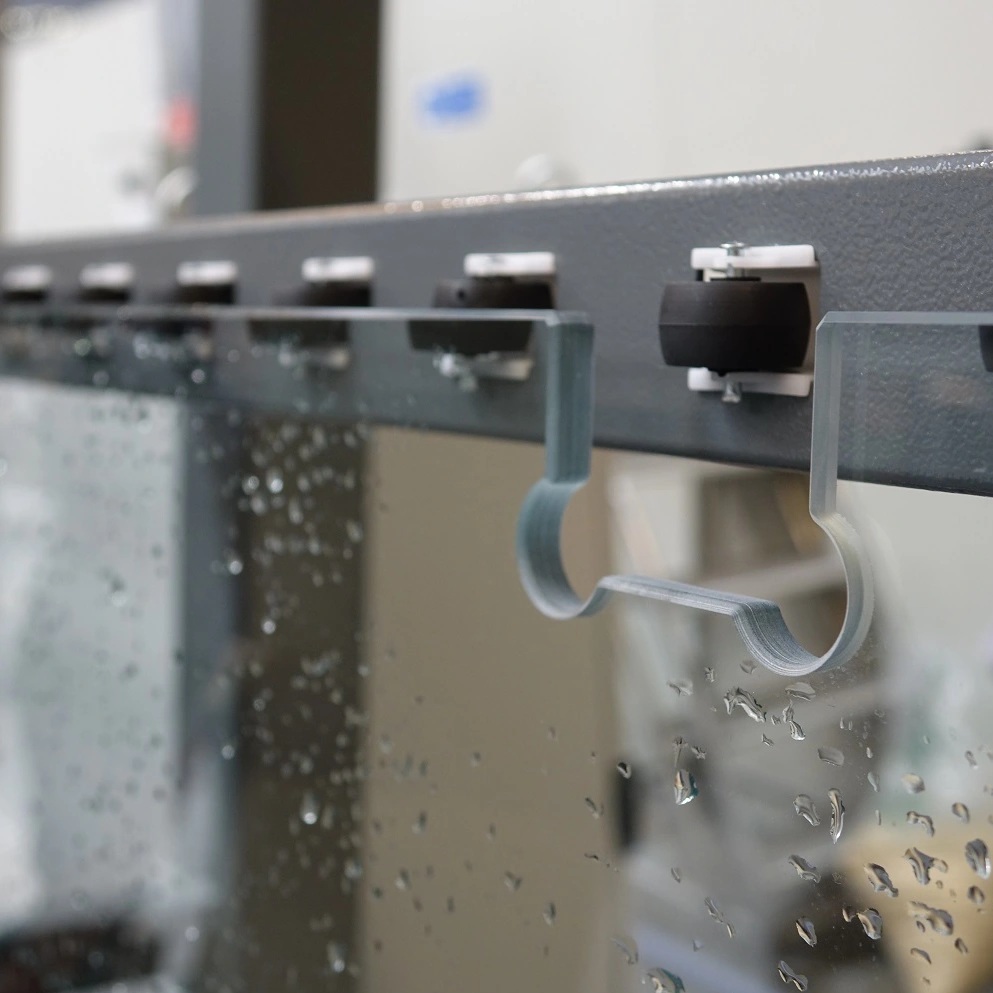 Den lodrette konstruksjonen gir et kompakt fotavtrykk og effektiv materialhåndtering. Glassplaten posisjoneres automatisk via motoriserte valser og holdes stabilt på plass med sugekopper nær arbeidsområdet, noe som sikrer vibrasjonsfri bearbeiding og jevn kvalitet – også ved serieproduksjon.